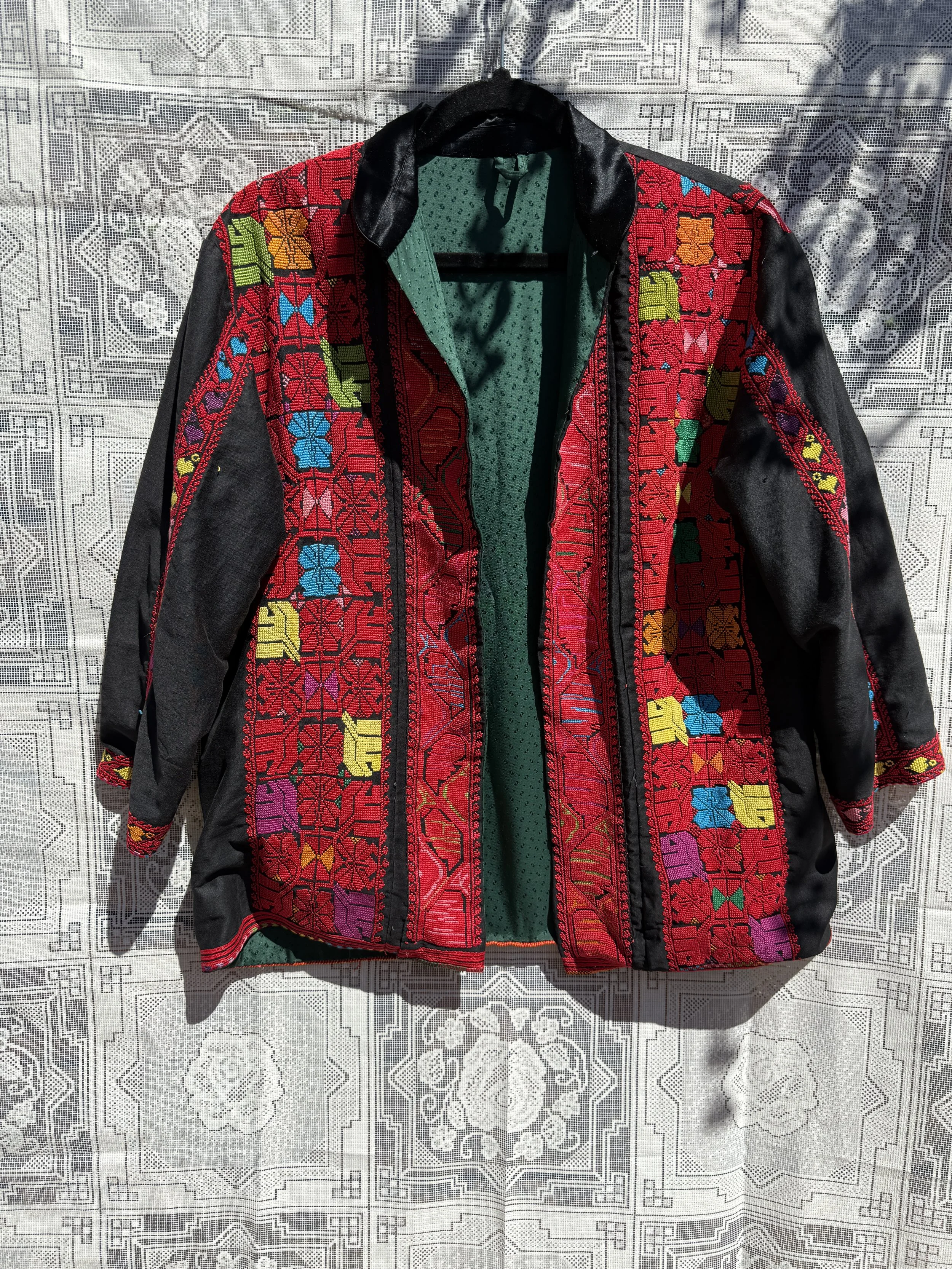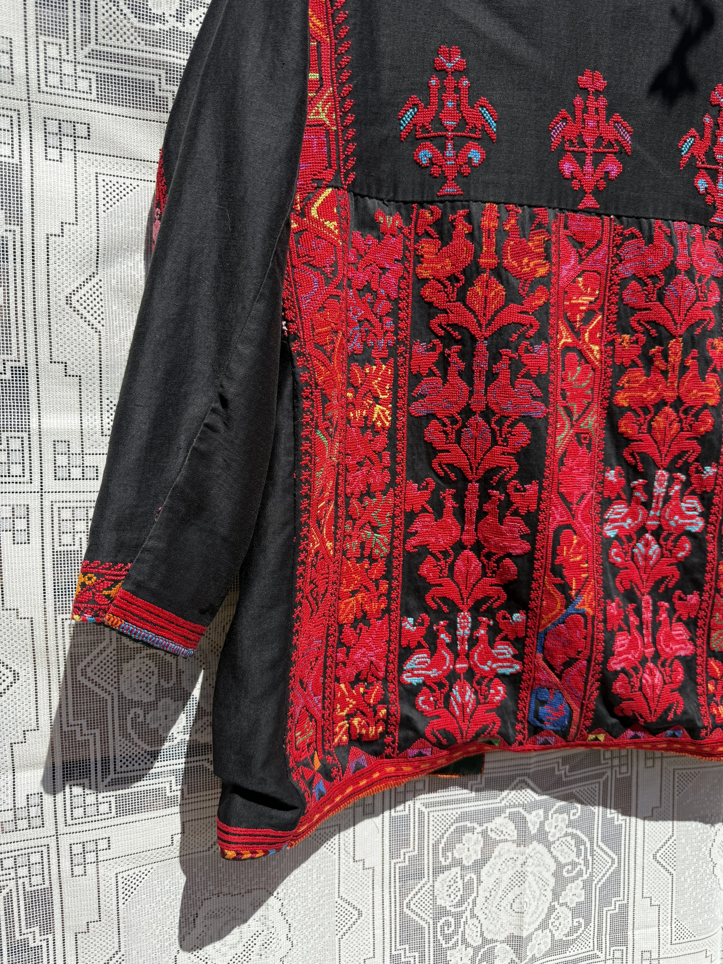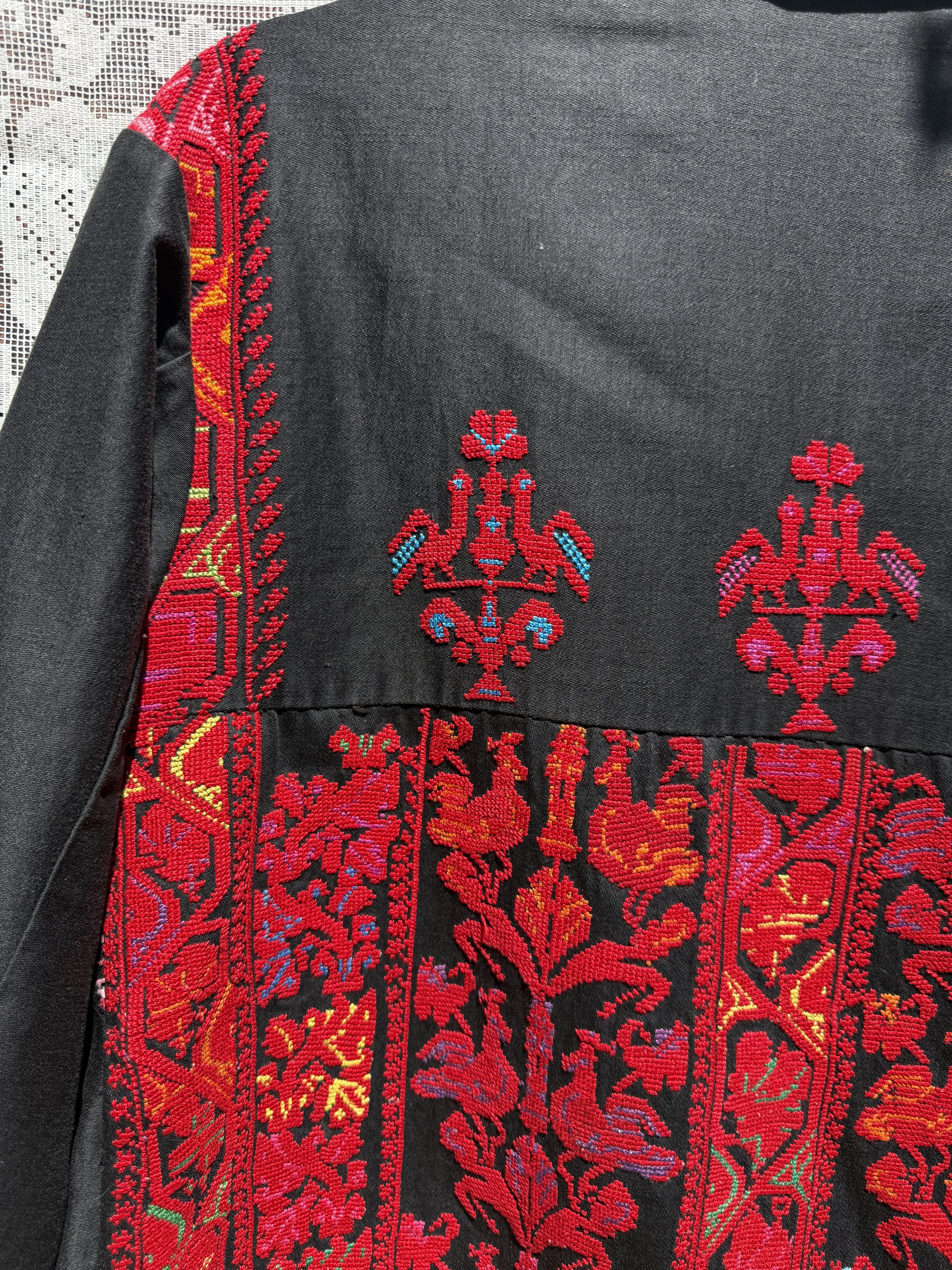 This one-of-a-kind blazer was upcycled from a hand-embroidered thobe, likely made in the 1950s–1960s. The embroidery features roosters (deek), symbols of renewal and a new day, alongside birds (asfoor), symbols of freedom.