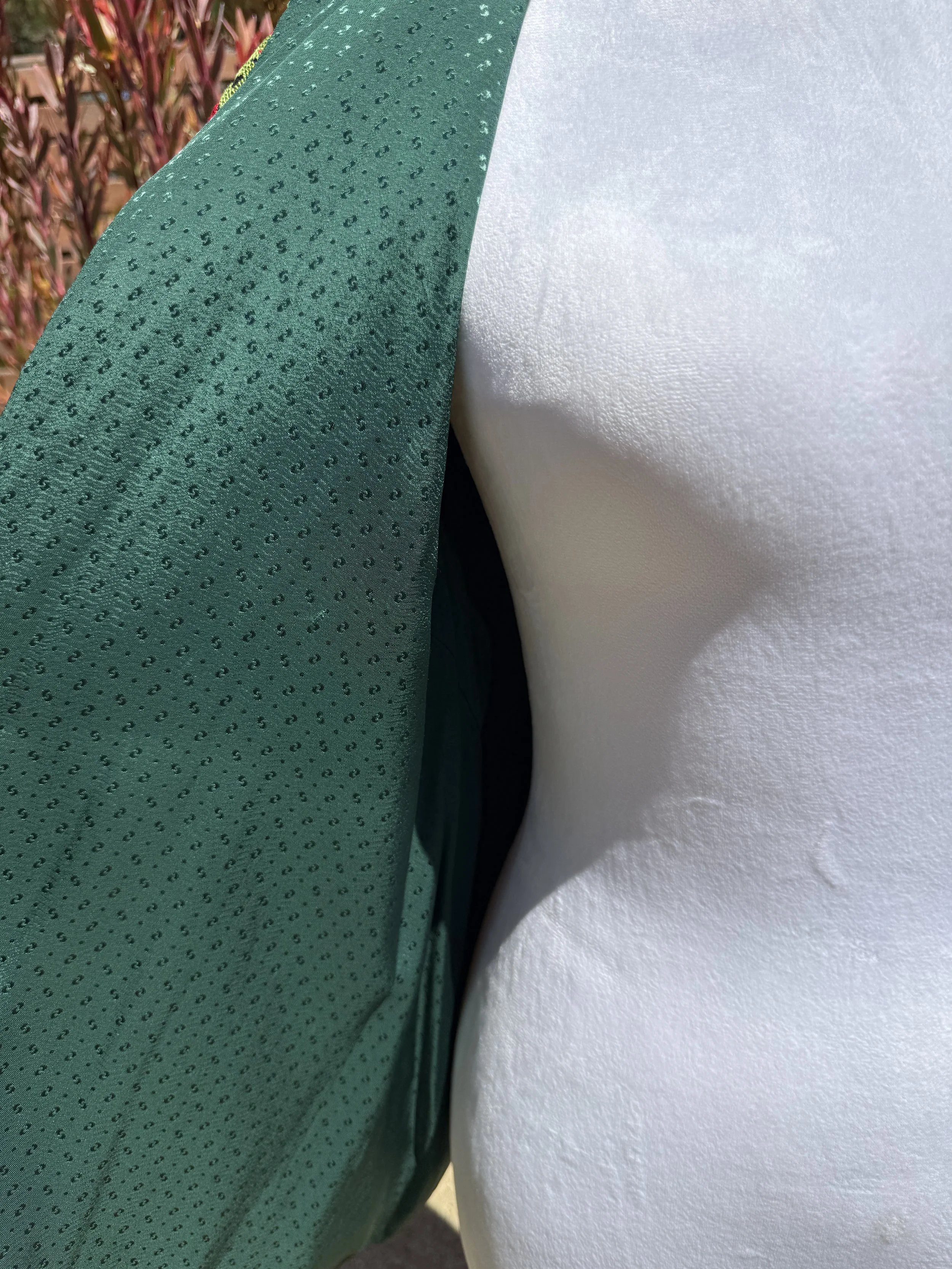 The base fabric with the embroidery is a cotton Qmaash. The lining is a green polyester satin.